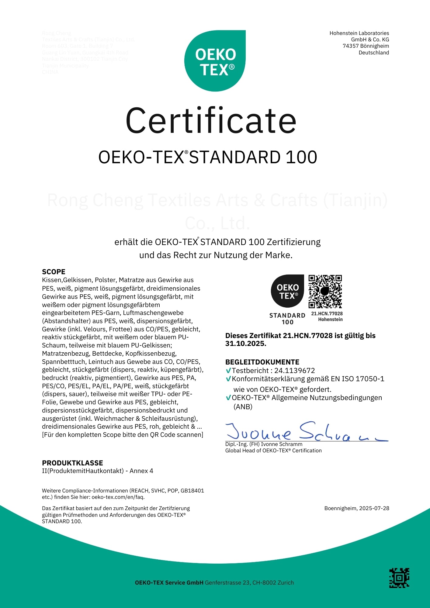 OEKO-TEX® STANDARD 100 · Zertifikat Nr. 21.HCN.77028, Prüfinstitut: Hohenstein Laboratories, gültig bis 10/2025